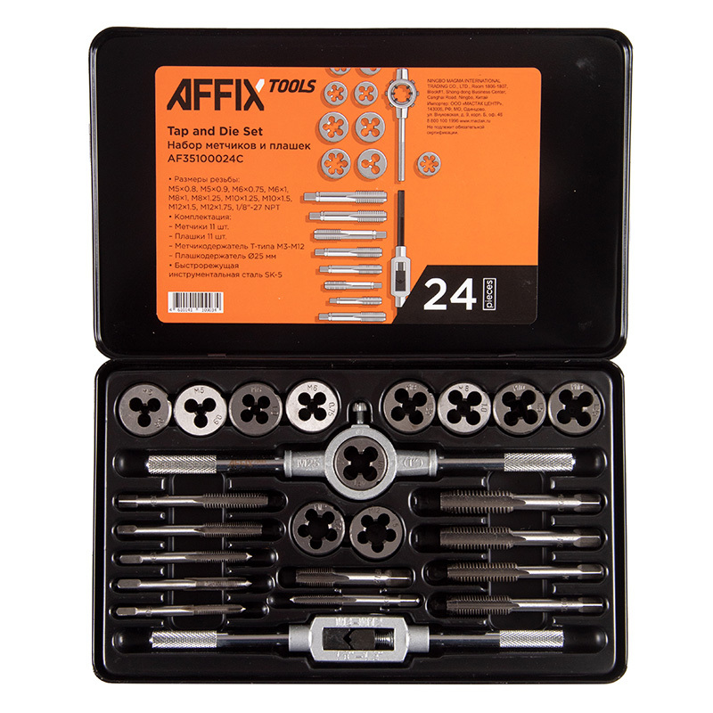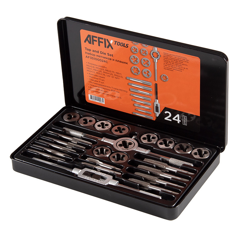 Набор AFFIX AF35100024C содержит метчики и плашки разных видов, а также все необходимое для нарезания внутренней и наружной резьбы.
