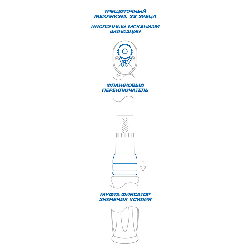 • Механизм фиксации установленного значения срабатывания ключа исключает случайный проворот рукоятки.