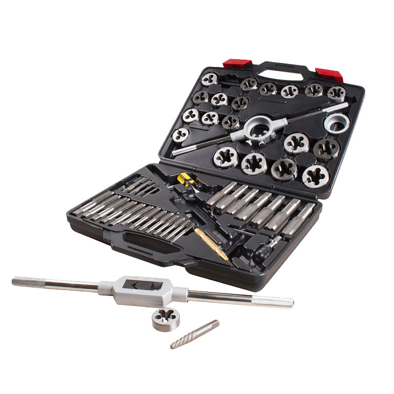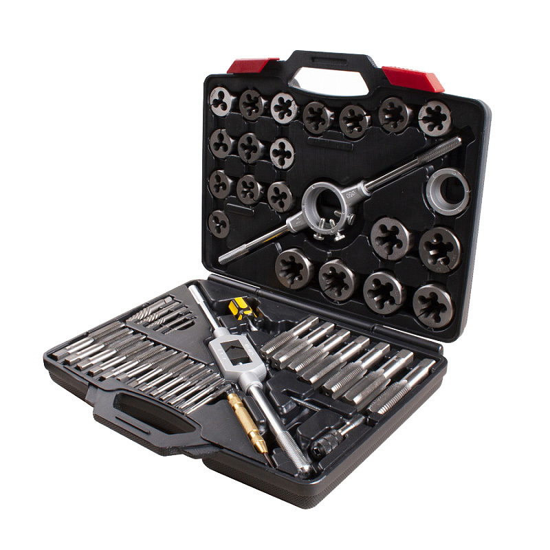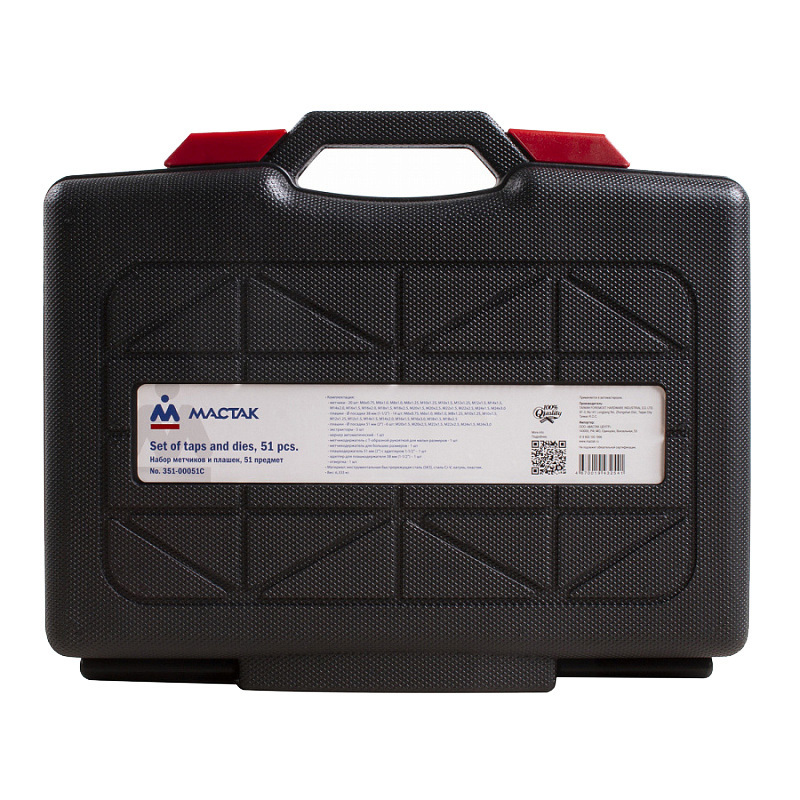 Набор МАСТАК 351-00051C содержит метчики и плашки разных видов, а также все необходимое для нарезания внутренней и наружной резьбы. Для удобства хранения и транспортировки детали помещены в пластиковый кейс.